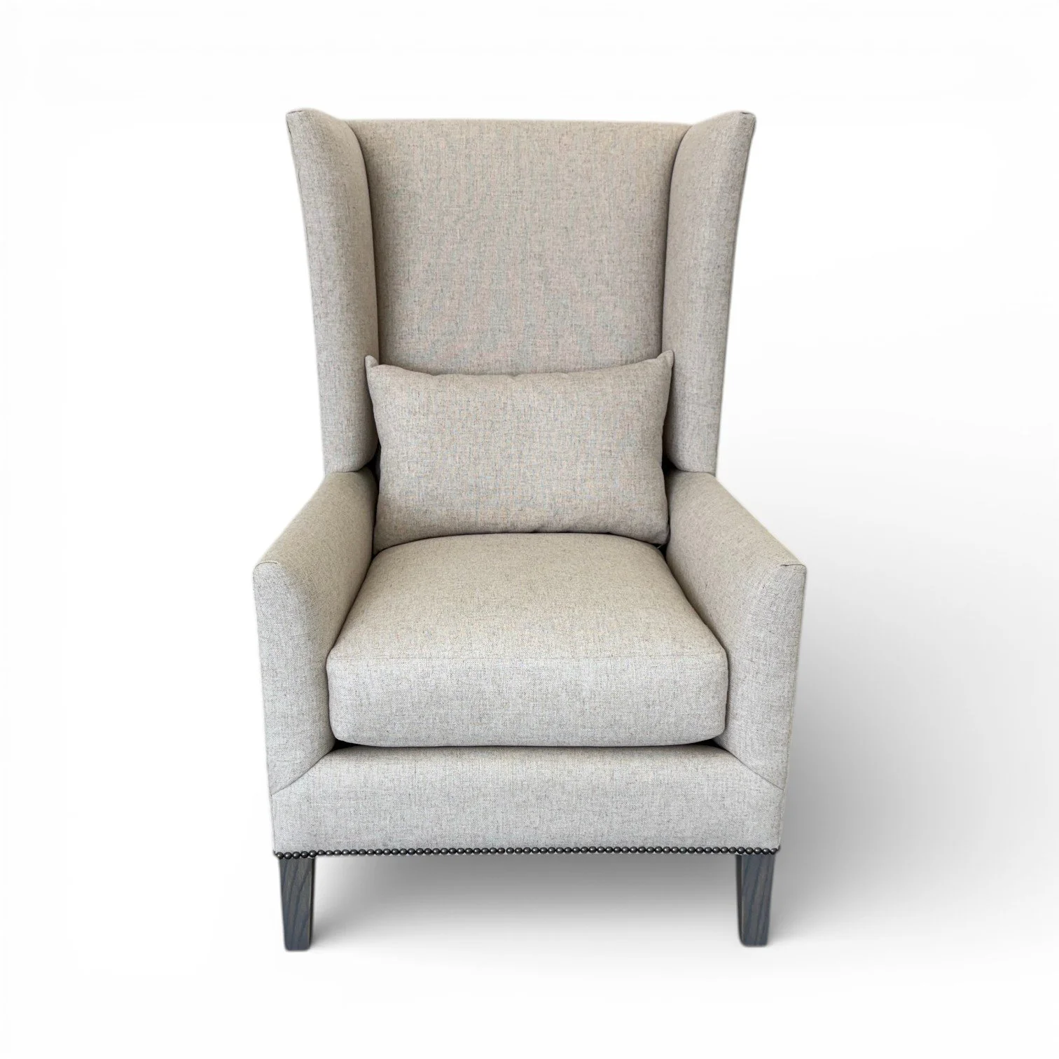 This chair combines timeless craftsmanship with a clean, transitional look. The solid wood frame features straight, squared legs with a warm stained finish, giving it a sturdy and grounded feel. Its fully upholstered seat and back are finished with double-row nailhead trim for a tailored, refined edge. The gently curved seat offers extra comfort and a subtle custom detail, making it a perfect blend of traditional and modern style—ideal for dining rooms, offices, or accent seating.